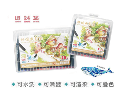 軟頭水彩筆,提供18、24、36色選擇,可水洗、漸變、渲染與疊色,創意表現豐富多元。