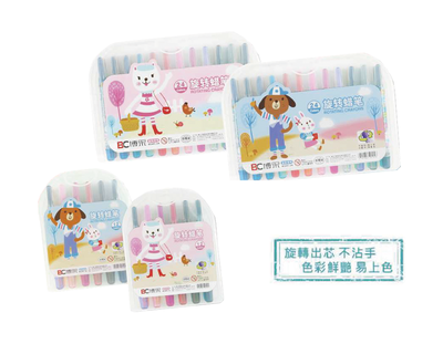 旋轉式環保無毒蠟筆,提供12色與24色,旋轉出芯不沾手,色彩鮮豔,使用簡單易上手。